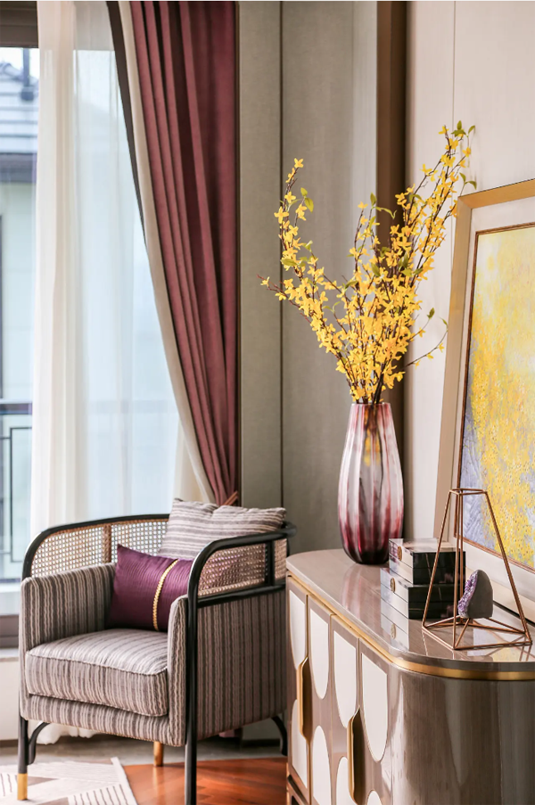 窗簾可以使用豆沙紅色,紅色對冬日的室內有卓越的貢獻,熱情如火,而豆沙紅增添溫柔感,整個冬天充滿濃濃愛意。