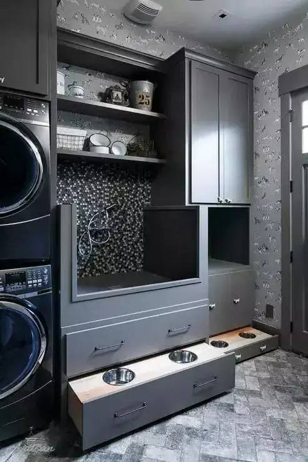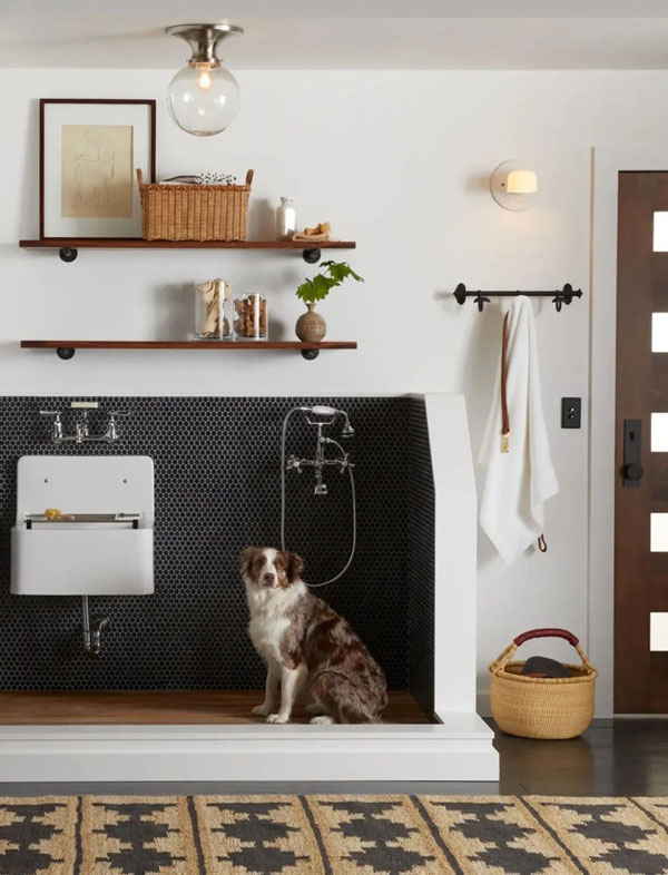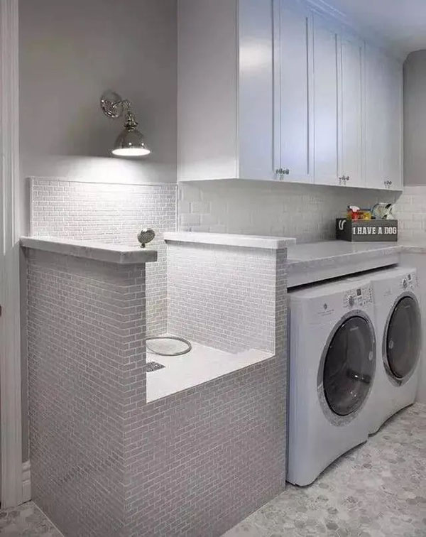 寬敞的浴室以及大小合適的淋浴間或浴缸高度,是寵物洗澡的最佳地點(diǎn),有條件的話也可設(shè)計(jì)一個(gè)帶有無障礙淋浴噴頭的寵物洗浴臺(tái)。