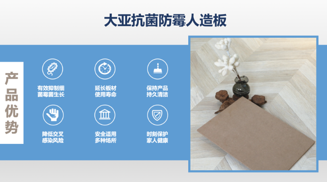 南方春季多雨,北方多沙塵,大家記得防霉抗菌,除了日常的清潔工作,也可以選擇具有防霉抗菌功能的家具,讓家潔凈溫馨。大亞人造板的抗菌防霉板能有效抑制霉菌的滋生,減少細菌對家具和人體的傷害,健康環(huán)保、舒適美觀。