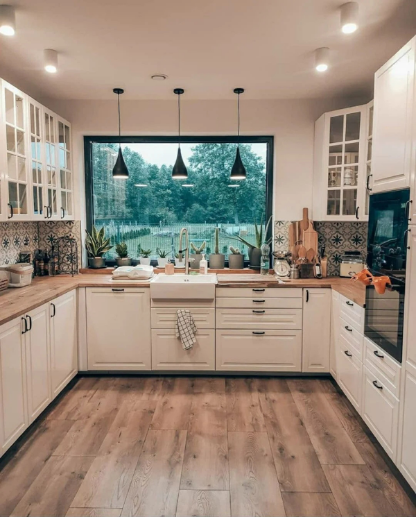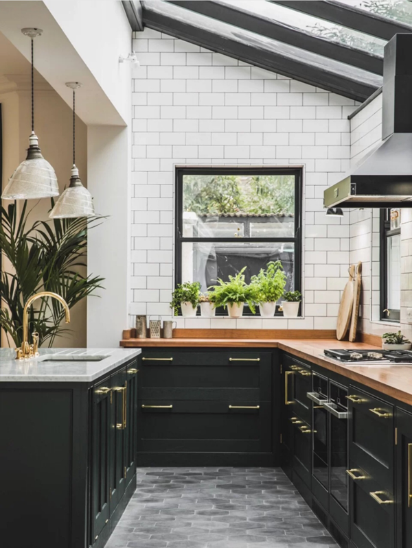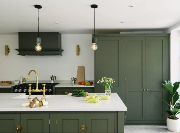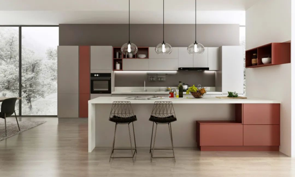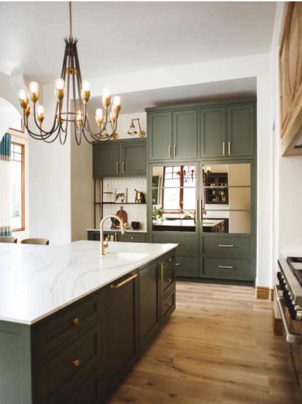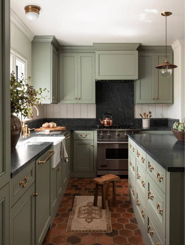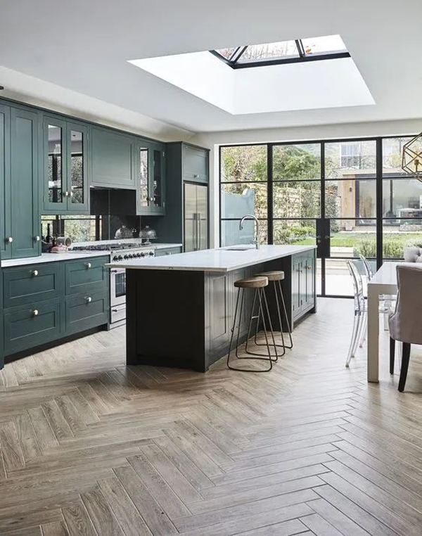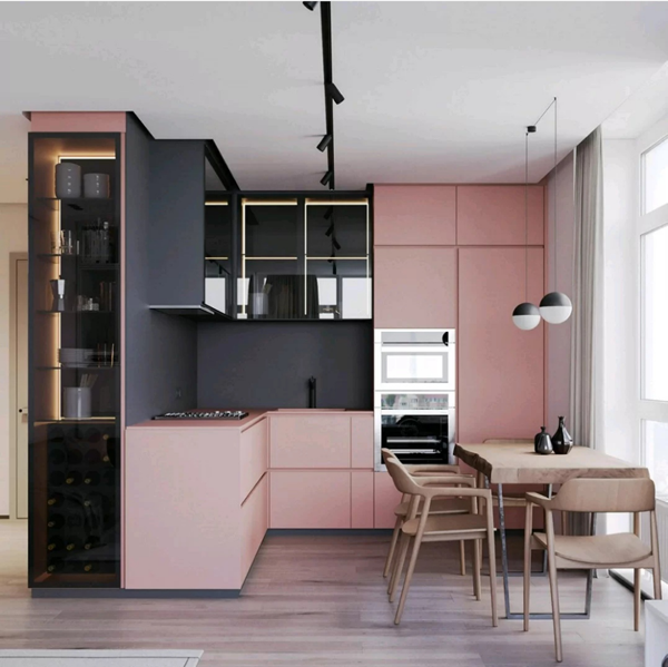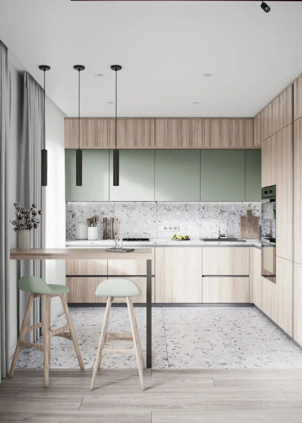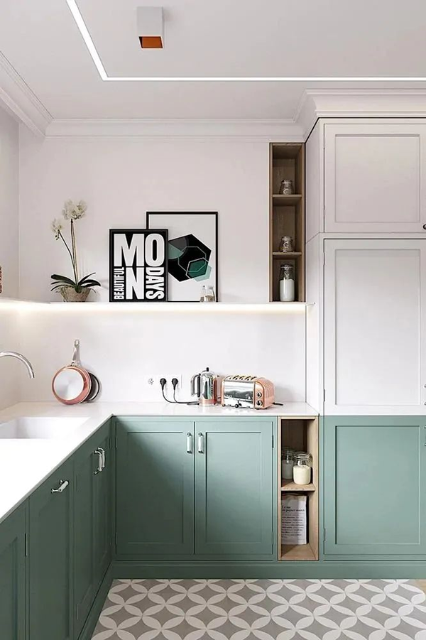 偏冷的淺淡的綠色,可以搭配黑色或原木色,適合現(xiàn)代風(fēng)格,小廚房與大廚房都很適合,門(mén)板造型要盡量簡(jiǎn)單,拉手也可以藏起來(lái)。
