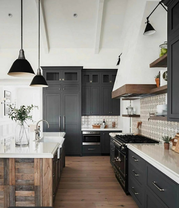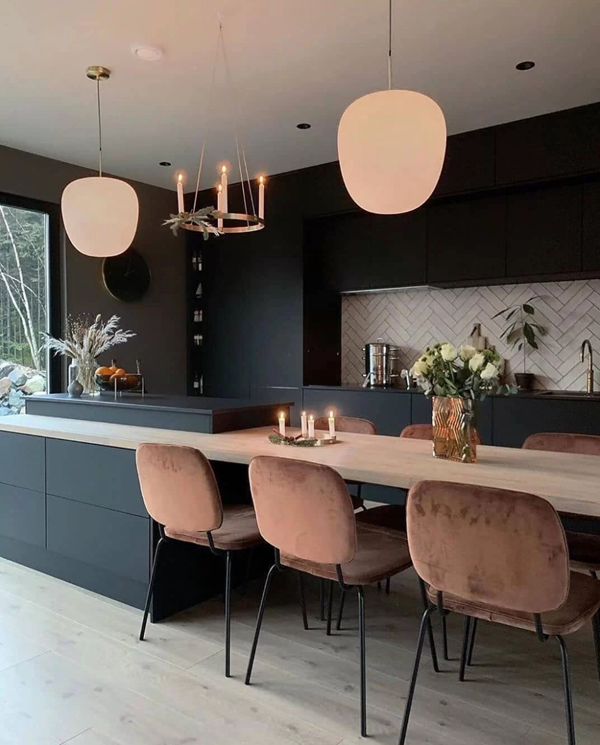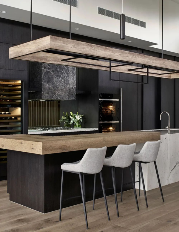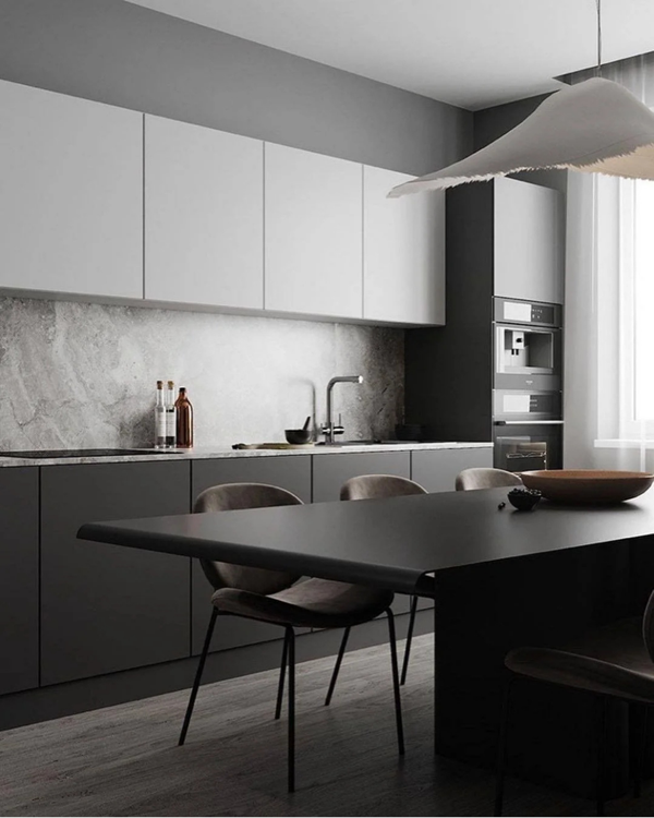 黑色搭配小部分原木色,適合現(xiàn)代風(fēng)格,顯得更加時(shí)尚,同樣也建議是開(kāi)放式空間才考慮這種深沉的配色。