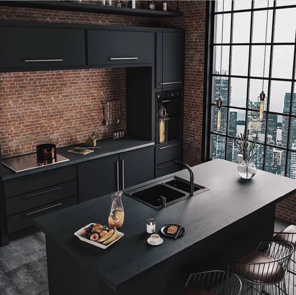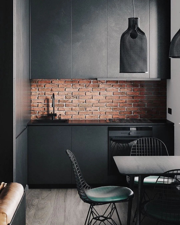 紅色磚墻自帶復(fù)古情調(diào),有一種中世紀(jì)的感覺(jué),配上純黑磨砂櫥柜,互相映襯。