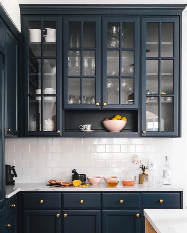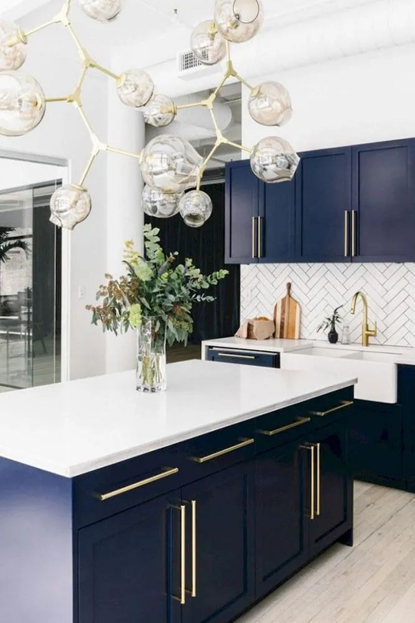 深藍(lán)色搭配白色,可以用在美式混搭風(fēng)格里,下柜門(mén)板做些簡(jiǎn)單造型 ,吊柜做白色玻璃門(mén),深藍(lán)色和白色的對(duì)比很強(qiáng)烈,整體的呈現(xiàn)會(huì)很干凈。