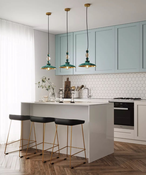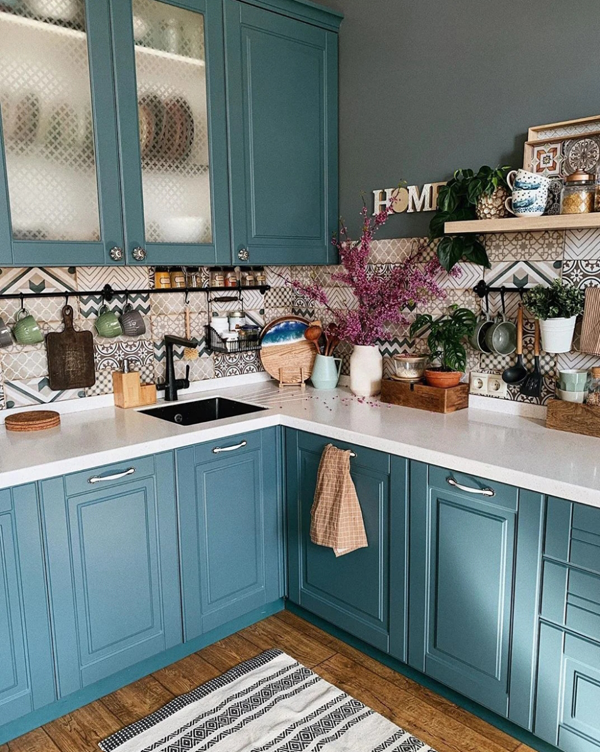湖藍(lán)色搭配白色主色調(diào),門(mén)板造型簡(jiǎn)單就好,能讓空間時(shí)尚且干凈,顏色跳脫的櫥柜,復(fù)雜的造型反而會(huì)不好看,失去美感。