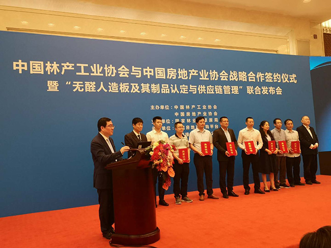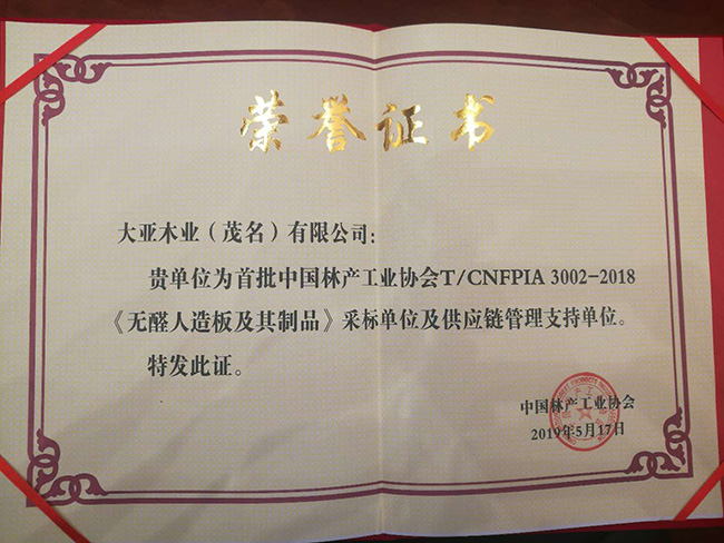 大亞人造板集團(tuán)有限公司受邀參會(huì)并領(lǐng)取了由中國林產(chǎn)工業(yè)協(xié)會(huì)頒發(fā)的首批T/CNFPIA 3002-2018《無醛人造板及其制品》采標(biāo)單位及供應(yīng)鏈管理支持單位榮譽(yù)證書。