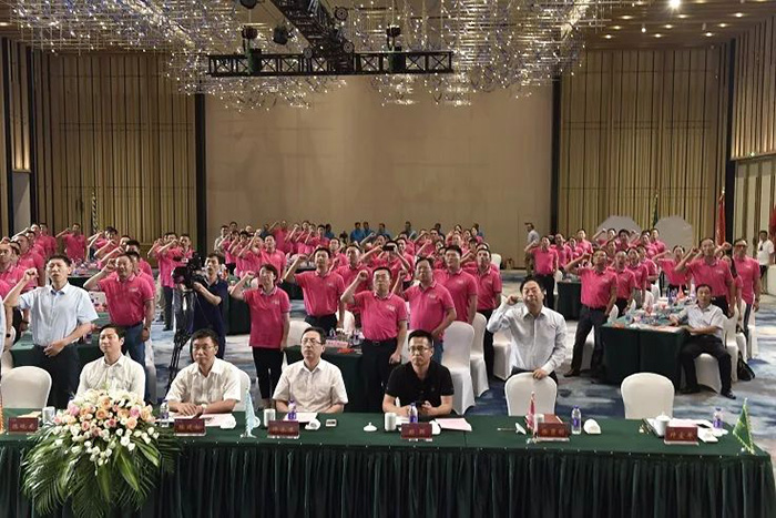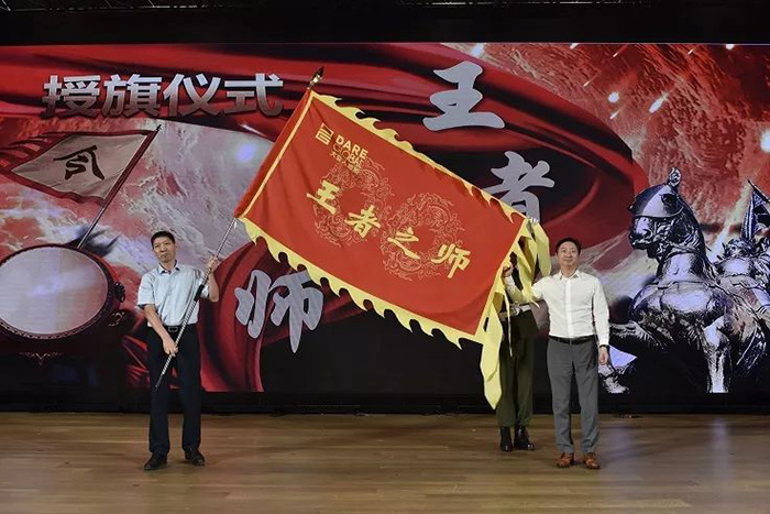 董事長(zhǎng)講話(huà)之后,現(xiàn)場(chǎng)舉行了授旗儀式。董事長(zhǎng)將寫(xiě)有“王者之師”的大旗授予程總,預(yù)祝人造板集團(tuán)圓滿(mǎn)完成年度目標(biāo)任務(wù)。隨后,與會(huì)人員舉起右手共同進(jìn)行了沖刺年度目標(biāo)的宣誓儀式。最后,在全場(chǎng)有節(jié)奏的吶喊聲中誓師大會(huì)達(dá)到高潮。