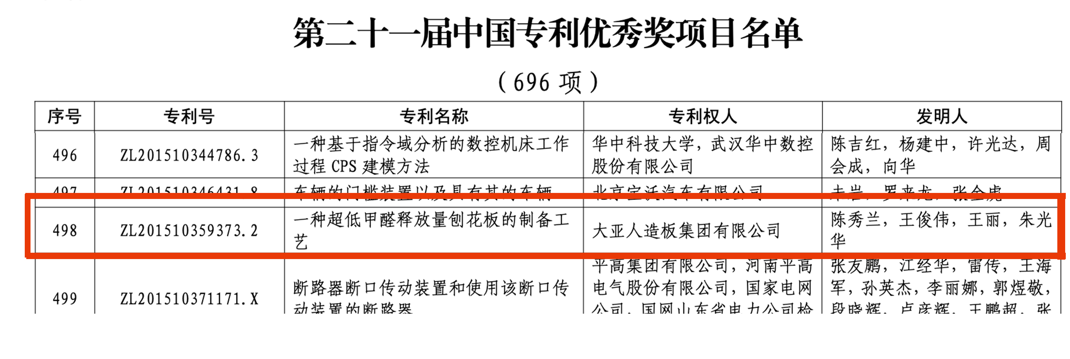 7月14日,國(guó)家知識(shí)產(chǎn)權(quán)局發(fā)布關(guān)于第二十一屆中國(guó)專利獎(jiǎng)授獎(jiǎng)的決定,大亞人造板集團(tuán)有限公司(以下簡(jiǎn)稱大亞人造板)的“一種超低甲醛釋放量刨花板的制備工藝”榮膺本屆中國(guó)專利優(yōu)秀獎(jiǎng)。