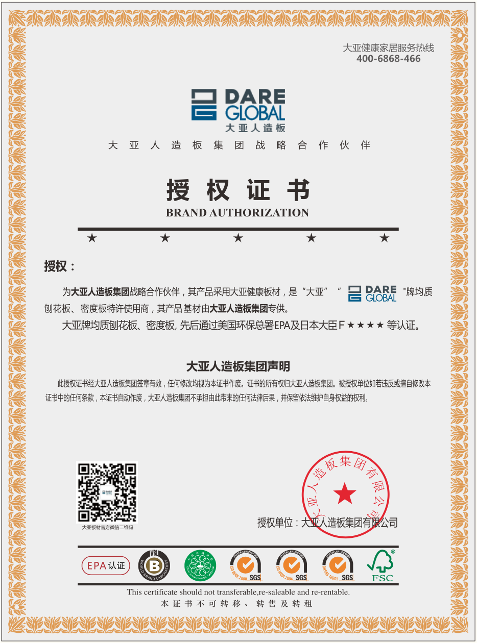 正因為大亞人造板的優(yōu)秀,造就了它中國人造板第一品牌的行業(yè)地位,也正因為大亞人造板的優(yōu)秀,不法商家用劣質(zhì)產(chǎn)品假冒大亞板材的事時有發(fā)生。因此大亞人造板實施了嚴格的授權(quán)證書管理方案,讓消費者買的放心,用的舒心。