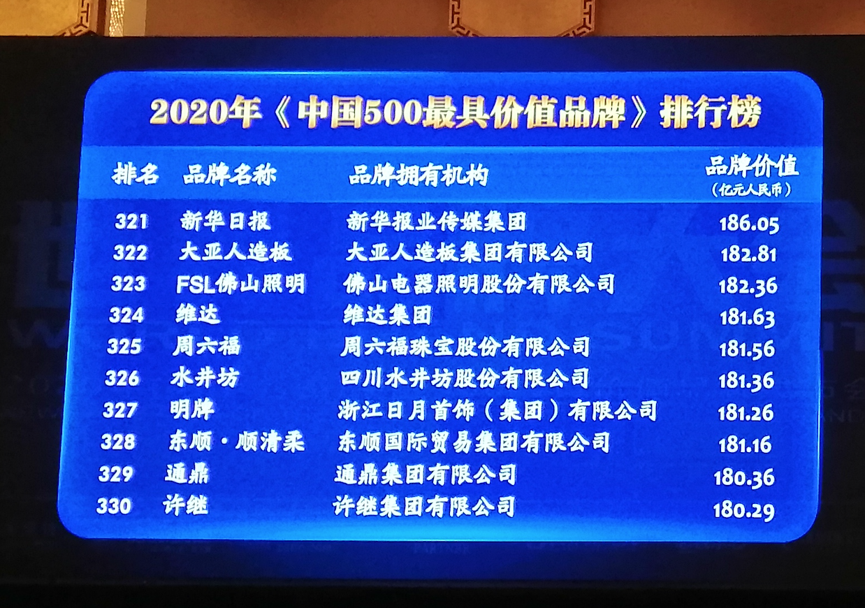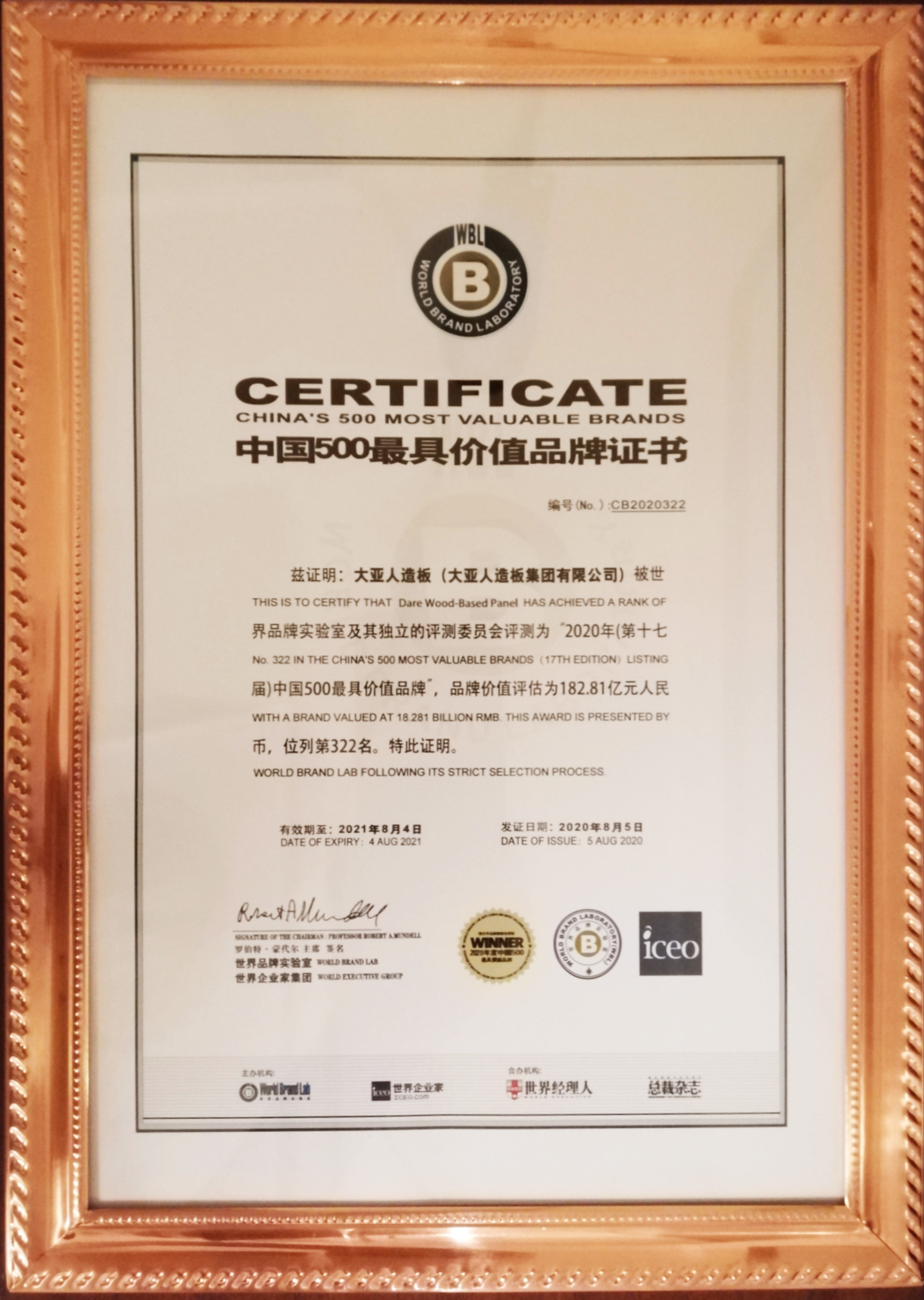 8月5日,由世界品牌實(shí)驗(yàn)室(World Brand Lab)主辦的(第十七屆)“世界品牌大會(huì)”在北京舉行,會(huì)上發(fā)布了2020年《中國500最具價(jià)值品牌》分析報(bào)告。在這份基于財(cái)務(wù)數(shù)據(jù)、品牌強(qiáng)度和消費(fèi)者行為分析的年度報(bào)告中,大亞人造板以182.81億元品牌價(jià)值蟬聯(lián)中國人造板行業(yè)榜首,品牌排名322位,價(jià)值增幅15.2%,成為連續(xù)4年榮登最具價(jià)值品牌(人造板行業(yè))榜首的人造板企業(yè)。