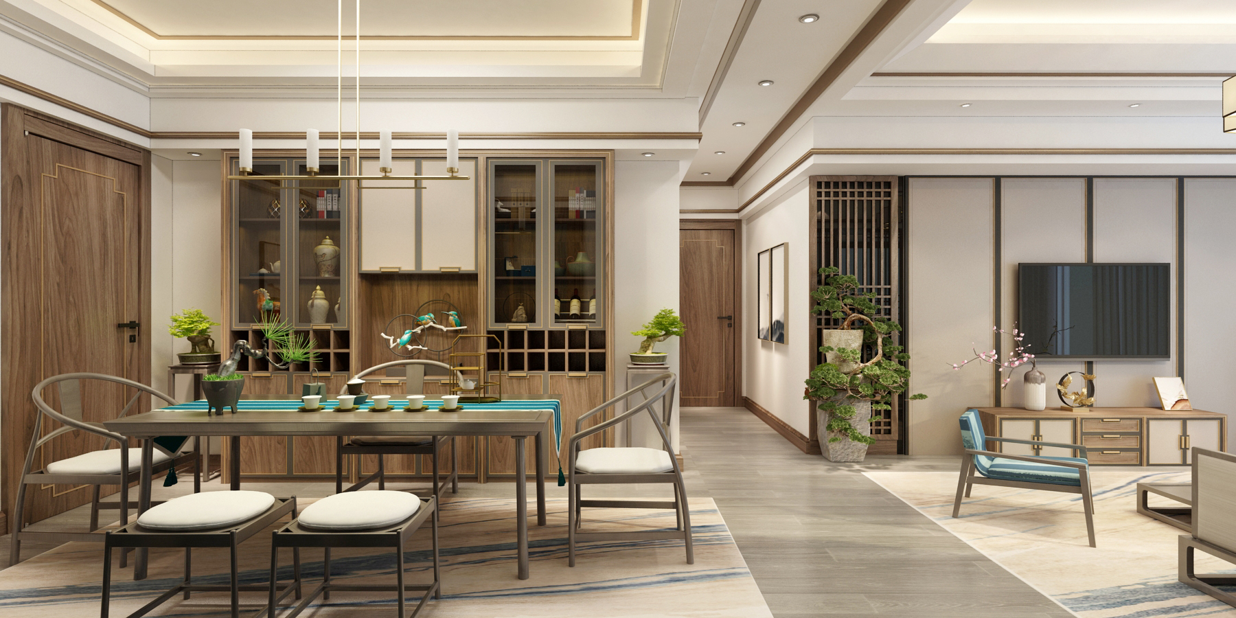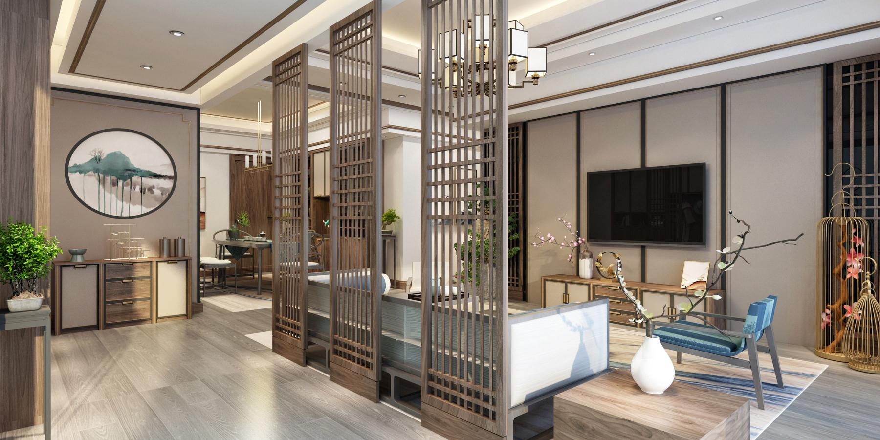 客廳里電視背景墻兩側(cè)對稱的木質(zhì)格柵與玄關(guān)處的格柵遙相呼應(yīng),左側(cè)的木質(zhì)格柵前放上一盆綠葉觀賞植物,令人感到居室的靜謐與溫馨;而右側(cè)的鳥籠裝飾物于細節(jié)之處展示中國的傳統(tǒng)文化韻味。