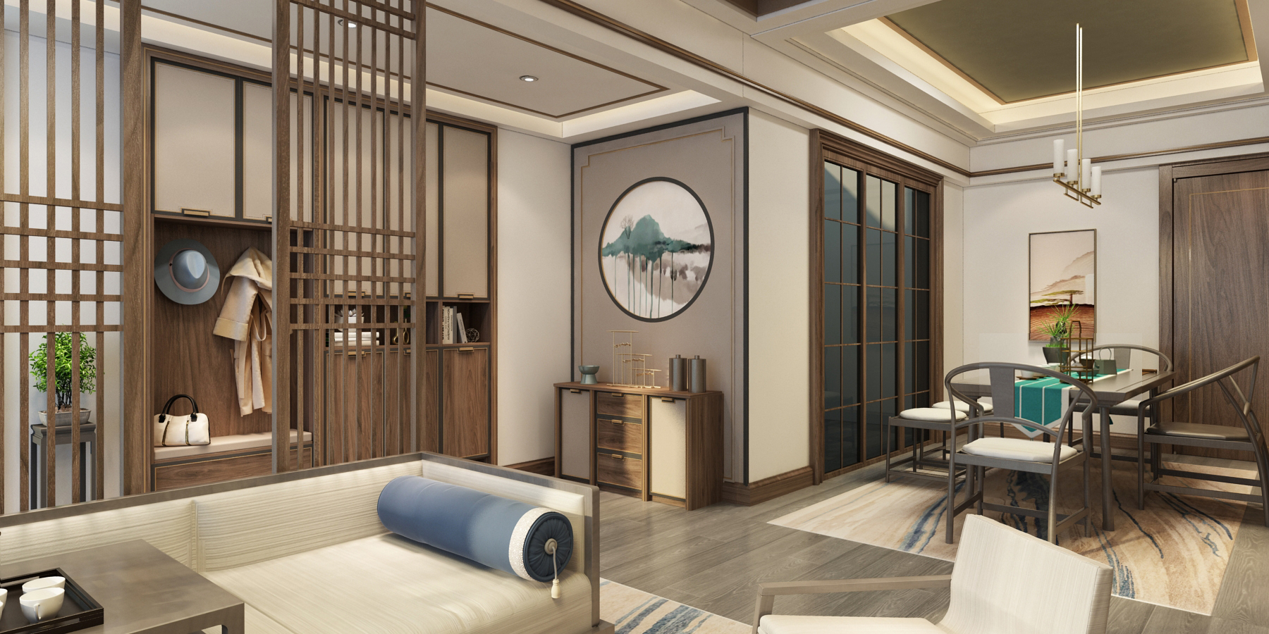 玄關(guān)盡頭是山水畫與木質(zhì)家具的黃金搭配,方正的墻面與家具搭配圓形的山水畫,將中國傳統(tǒng)里“方圓”的裝飾觀念體現(xiàn)得淋漓盡致。