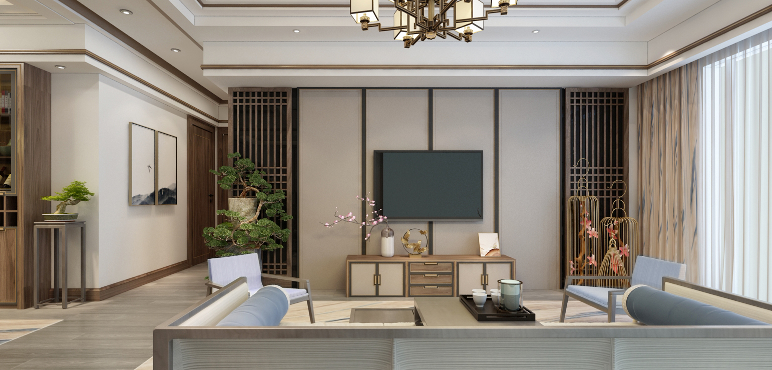 新中式風格利用后現(xiàn)代手法,在提取明清家具理念的精華上進行豐富,講究移步換景,多采用對稱式的布局方式,格調(diào)高雅,造型簡樸優(yōu)美。中國傳統(tǒng)室內(nèi)陳設(shè)包括字畫、掛屏、盆景、屏風、博古架等,追求一種修身養(yǎng)性的生活境界。