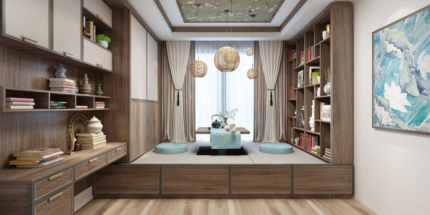 茶室采用榻榻米的設(shè)計,高度適宜,兩側(cè)是半開放設(shè)計的書架,空間在虛實相生的情景之中,活躍著生命律動的韻味,讓人體會到中國文人雅士所稱的“詩意空間”。而方正的整體布局和圓形的吊燈則蘊含著中華文明“天圓地方”的古典文化。