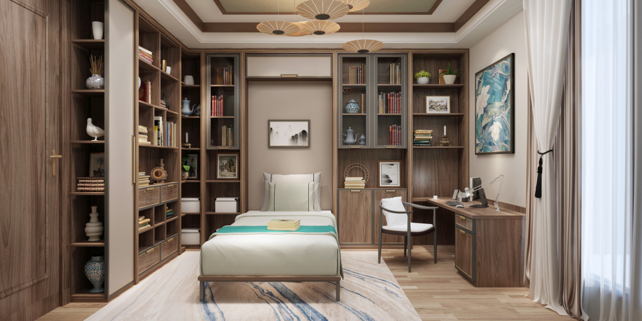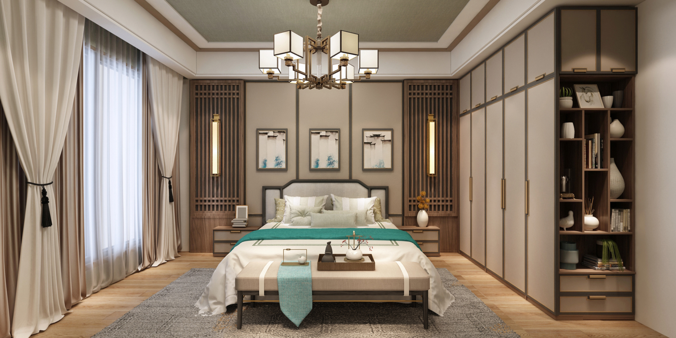 臥室背景以淺色木飾面為基調(diào),掛上三幅白墻黑瓦的水墨畫,床頭兩側(cè)對稱的木質(zhì)格柵及嵌入式床頭燈,再加上現(xiàn)代感的床與窗簾,濃濃古韻的居室滲透出幾絲現(xiàn)代氣息。