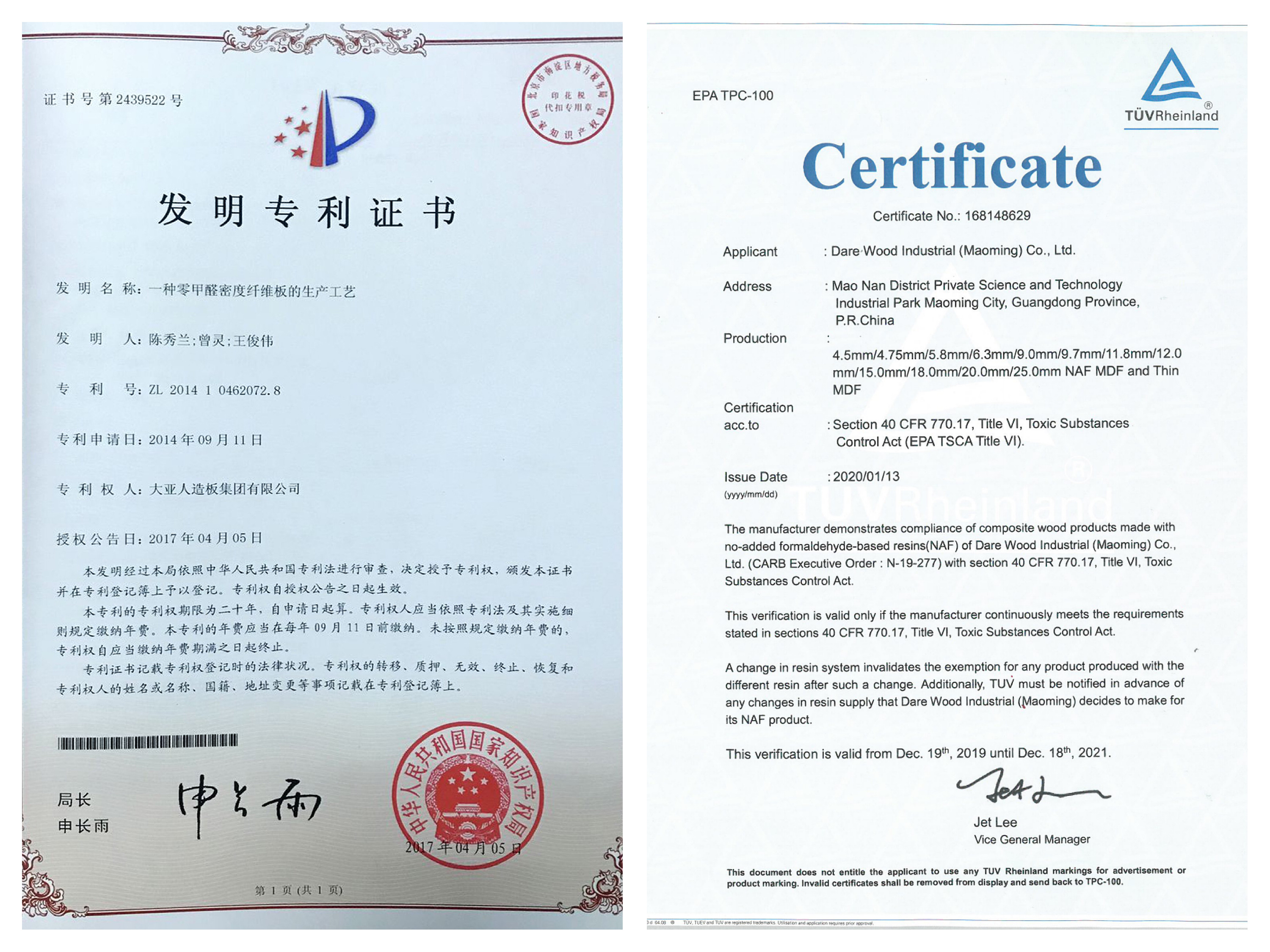 大亞人造板于2017年取得“一種零甲醛密度纖維板的生產(chǎn)工藝”發(fā)明專(zhuān)利證書(shū)。大亞無(wú)醛添加纖維板通過(guò)EPA無(wú)醛認(rèn)證,零甲醛,對(duì)人體無(wú)健康危害。