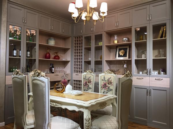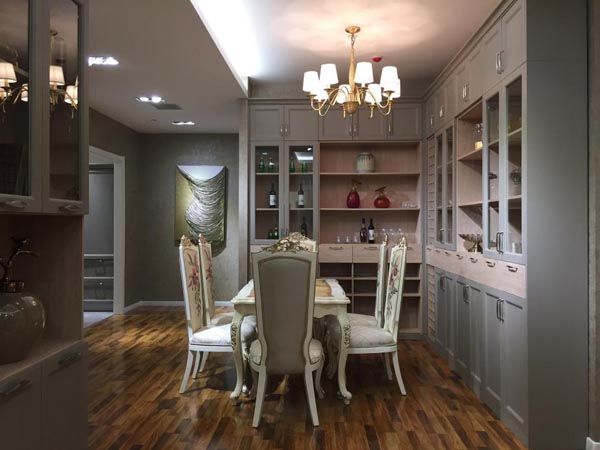 餐廳,高級灰作為主色的儲物柜,中間部分木色的拼接搭配更添時尚感。歐式風(fēng)格的餐桌椅,低調(diào)中增添了些許華麗藝術(shù)感,凸顯了主人的高級品味。