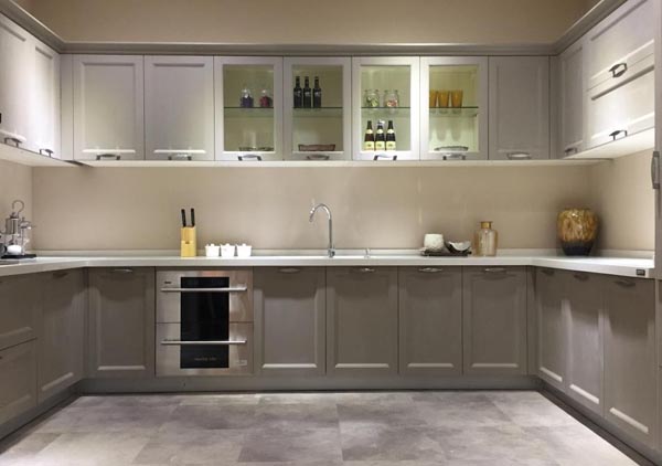 莫蘭迪灰的櫥柜與白色的墻面,再配合灰色斑駁的地磚,整個廚房空間的設(shè)計時尚簡約而不失雅致。