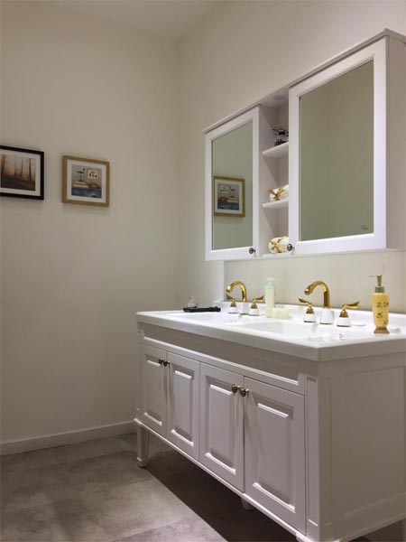 衛(wèi)生間的對稱雙洗漱臺時尚優(yōu)雅,黃銅的水龍頭增添了一絲復(fù)古氣息。