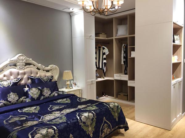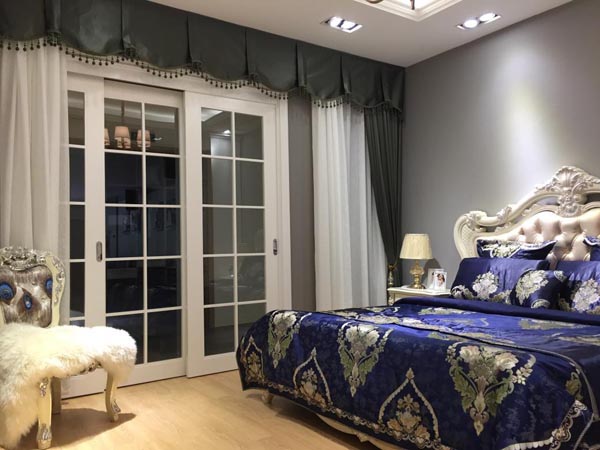 主臥的硬裝以淺灰、白色為主,配以原木色地板,整體較為柔和,而軟裝的深藍(lán)色床品華麗復(fù)古,兩種色系產(chǎn)生了強烈的視覺碰撞,設(shè)計感十足。