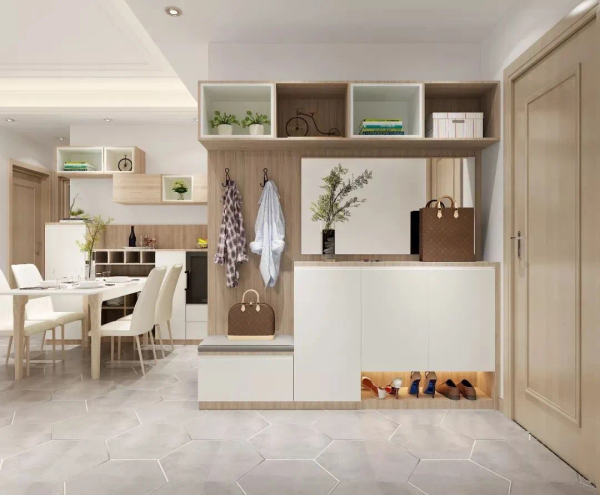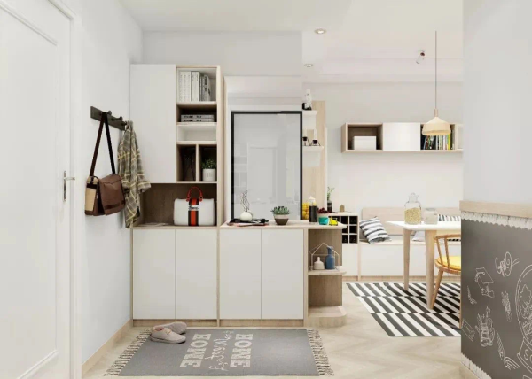 入門處除了設(shè)計鞋柜、雜物儲物柜、換鞋凳、外套掛放處之外,許多人開始在玄關(guān)設(shè)置一高一低兩個物品中轉(zhuǎn)臺,高臺放置干凈的包包、手機、鑰匙、口罩、消毒用品等,低臺放置衛(wèi)生比較差的包裹、菜品等,換鞋的時候才不會丟一地相互污染。