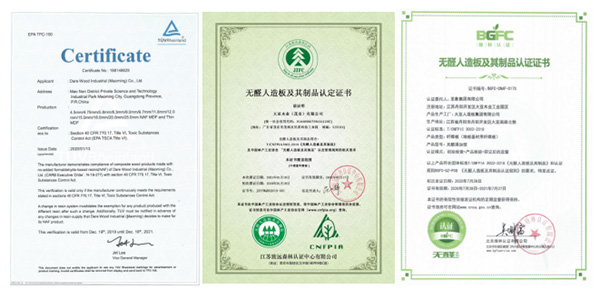 大亞無醛添加纖維板通過EPA無醛豁免認證和江蘇致遠無醛認證,纖維板(地板基材)通過北京綠林無醛認證,生產(chǎn)過程中零甲醛添加,對人體無健康危害。