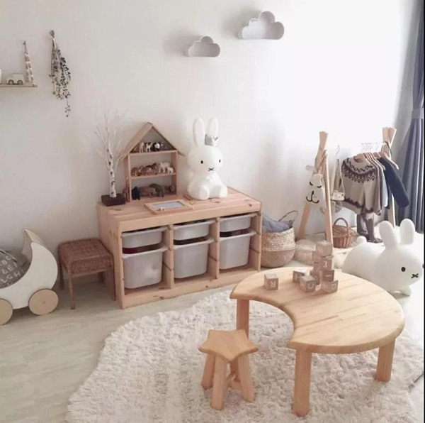 材質(zhì)上,宜以自然、環(huán)保、柔軟的材質(zhì)為佳,孩子比較活潑好動,要盡量選擇圓滑沒有銳利尖角的家具,或者用防撞包角將各個角包裹起來,以避免孩子碰傷。對于儲物柜要做好固定的工作,以防傾倒帶來的危險。