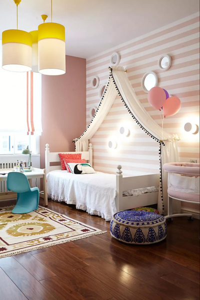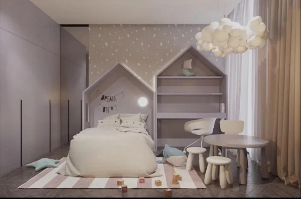 繁雜的顏色容易導(dǎo)致孩子注意力分散,過于艷麗的色彩讓孩子長期處于亢奮中,導(dǎo)致睡眠質(zhì)量較差。兒童的房間整體色彩宜以寧靜素雅為主,讓基本的調(diào)色板是中性的:白色,米色,灰色,裸色等。盡量選擇三種以內(nèi)能舒緩視覺疲勞的搭配色系,比如鵝黃色、淺粉色、淡藍色等。