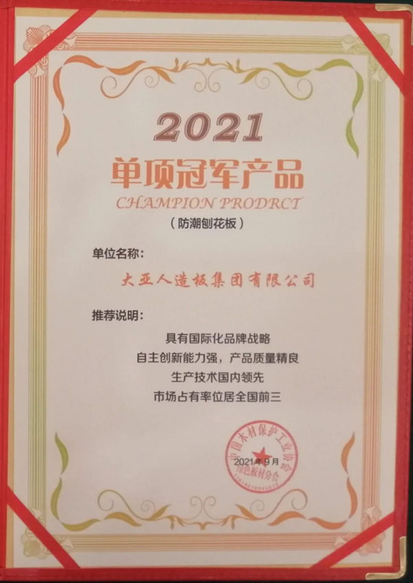 此外,大會(huì)還公布了2021單項(xiàng)冠軍產(chǎn)品獎(jiǎng),大亞人造板的防潮刨花板斬獲2021單項(xiàng)冠軍產(chǎn)品!