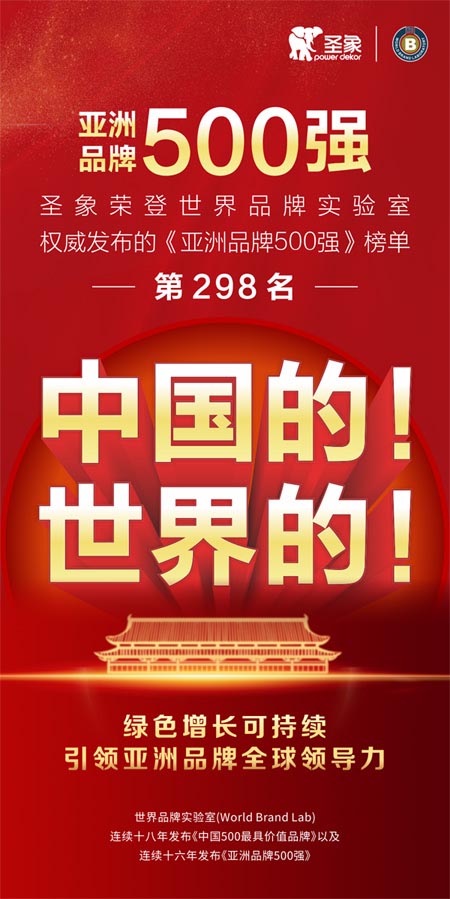 近日,由世界品牌實(shí)驗(yàn)室(World Brand Lab)主辦的第十六屆“亞洲品牌大會(huì)”在上海召開,會(huì)上發(fā)布了2021年《亞洲品牌500強(qiáng)》排行榜。在這份基于品牌影響力、市場(chǎng)占有率、品牌忠誠(chéng)度和亞洲領(lǐng)導(dǎo)力的年度報(bào)告中,圣象集團(tuán)榮登《亞洲品牌500強(qiáng)》榜單第298名,這是圣象連續(xù)5年蟬聯(lián)“亞洲品牌500強(qiáng)”。