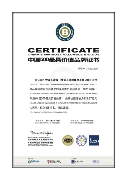 大亞人造板19年來精工細(xì)作,是中國人造板行業(yè)內(nèi)的品牌NO.1,被評(píng)為“中國500最具價(jià)值品牌(人造板行業(yè))”,并且榮獲“中國板材國家品牌”榮譽(yù)證書,好品牌質(zhì)量有保證。