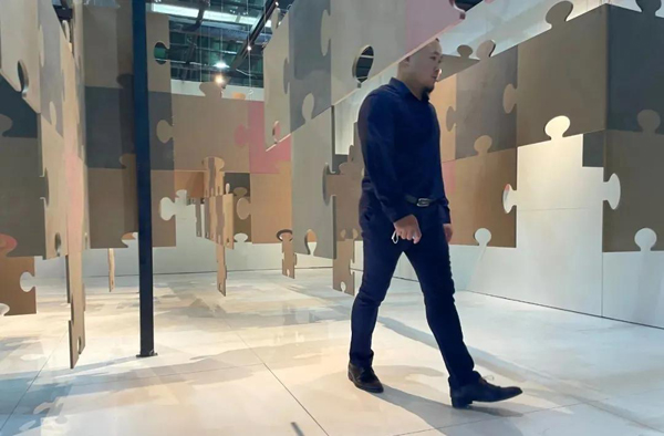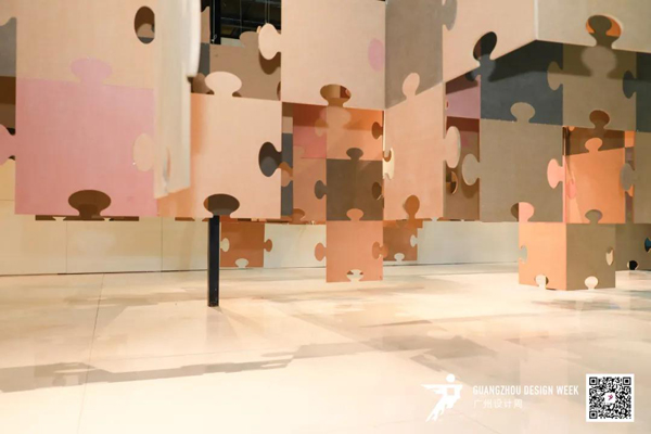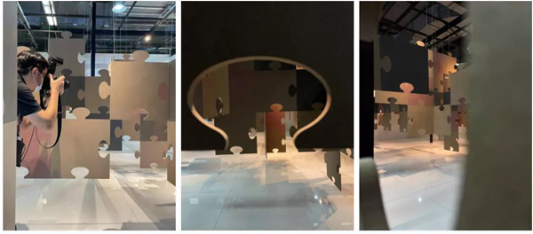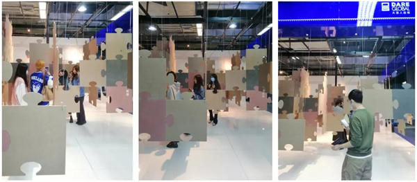 展廳是一個(gè)8m*9m的空間,整體的造型是一個(gè)懸浮的拼圖迷宮,迷宮隱喻這個(gè)社會(huì),每個(gè)拼圖板都代表一個(gè)個(gè)體,大家彼此相連成為集群,又彼此分離。地面的格子是1m*1m的距離,后疫情時(shí)代,這是人與人之間的安全距離。人們走進(jìn)迷宮,穿梭其中可以從視覺(jué)、觸覺(jué)、嗅覺(jué)近距離接觸大亞芯產(chǎn)品,體會(huì)這些默默無(wú)語(yǔ)的“好家伙”們,人與物的互動(dòng)性很強(qiáng)。