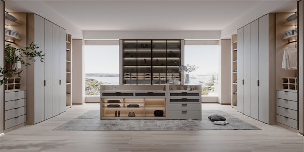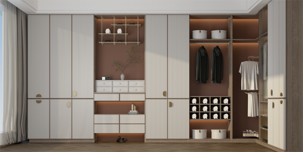衣帽間內(nèi)服裝種類多樣,做好合理的功能分區(qū)可以有效提高使用效率。將衣物懸掛區(qū)、疊放區(qū)、雜物區(qū)和鞋柜區(qū)等專用儲藏空間合理劃分,充分利用每一處角落。