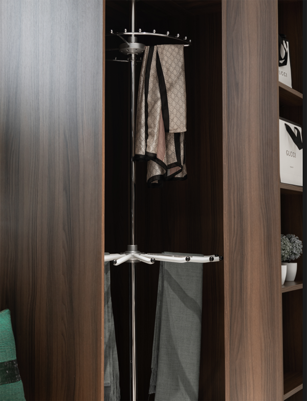 掛桿:衣物懸掛時要保持適當(dāng)?shù)木嚯x,不僅不會弄皺衣物,而且取放方便。還可以增設(shè)升降衣桿、領(lǐng)帶架等,把所有關(guān)于折痕的顧慮都排除在外,為自己的衣帽間再添亮點。