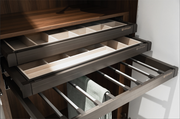 四邊拉籃:帶滑軌的四邊拉籃拿取方便,可以放一些經(jīng)常使用的小件衣物,比如內(nèi)衣、內(nèi)襯、襪子等。