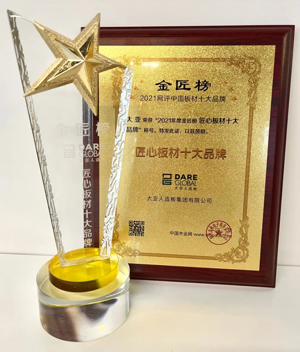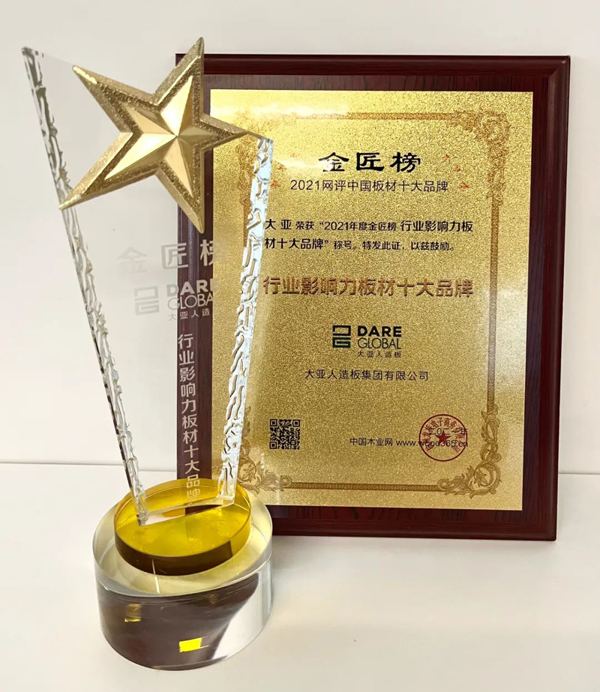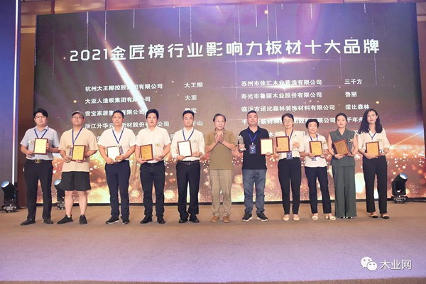 中國板材“金匠榜”頒獎典禮上,大亞人造板榮獲2021金匠榜“行業(yè)影響力十大品牌”、“匠心板材十大品牌”兩項殊榮!