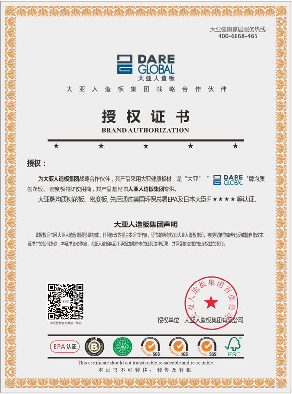 正因?yàn)榇髞喨嗽彀宓膬?yōu)秀,造就了它中國人造板頭部品牌的行業(yè)地位,也正因?yàn)榇髞喨嗽彀宓膬?yōu)秀,不法商家用劣質(zhì)產(chǎn)品假冒大亞板材的事時(shí)有發(fā)生。因此大亞人造板實(shí)施了嚴(yán)格的授權(quán)證書管理方案,讓消費(fèi)者買的放心,用的舒心。