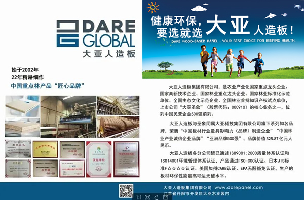 自2002年成立起,大亞人造板集團一直堅持綠色可持續(xù)發(fā)展道路,在環(huán)境治理及環(huán)保產(chǎn)品研發(fā)上的投入持續(xù)增加,率先推出E0級環(huán)保標準,通過ISO14001環(huán)境管理體系認證,產(chǎn)品通過FSC-COC認證、日本JIS標準F☆☆☆☆認證、美國加州CARB認證、美國EPA認證、中國ENF無醛認證,并且于2017年推出無醛系列人造板。2021年,大亞人造板集團各工廠均獲“中國綠色產(chǎn)品認證”!