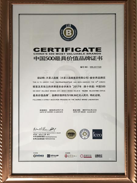 6月22日,由國際權(quán)威品牌評審機構(gòu)——世界品牌實驗室(World Brand Lab)主辦的“世界品牌大會”暨“2017年(第十四屆)中國500更具價值品牌”發(fā)布會在北京舉行,會上發(fā)布了2017 年“中國500 更具價值品牌”排行榜。在這份基于財務(wù)數(shù)據(jù)、品牌強度和消費者行為分析的年度報告中,大亞人造板以108.36億元人民幣的品牌價值榮登人造板行業(yè)榜首!