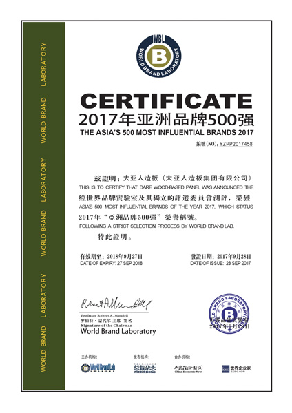 由世界品牌實(shí)驗(yàn)室和世界經(jīng)理人集團(tuán)共同編制和發(fā)布的2017年《亞洲品牌500強(qiáng)》排行榜于9月28日在香港揭曉,這是世界品牌實(shí)驗(yàn)室第十二次對(duì)亞洲品牌的影響力進(jìn)行的測(cè)評(píng), 共有20個(gè)國(guó)家和地區(qū)的500個(gè)品牌入選,中國(guó)、日本和韓國(guó)是入選品牌更多的三個(gè)國(guó)家?!秮喼奁放?00強(qiáng)》的評(píng)判標(biāo)準(zhǔn)是品牌的亞洲影響力,品牌影響力是指品牌開拓市場(chǎng)、占領(lǐng)市場(chǎng)、并獲得利潤(rùn)的能力。大亞人造板憑借在人造板行業(yè)多年的領(lǐng)導(dǎo)力、市場(chǎng)占有率和品牌忠誠(chéng)度成功入選《亞洲品牌500強(qiáng)》!