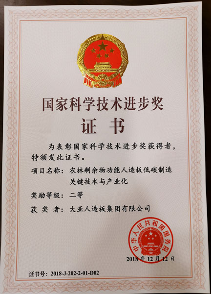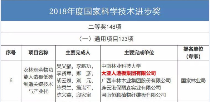 1月8日上午,2018年度國(guó)家科學(xué)技術(shù)獎(jiǎng)勵(lì)大會(huì)在北京人民大會(huì)堂舉行。習(xí)近平、李克強(qiáng)、王滬寧、韓正等黨和國(guó)家領(lǐng)導(dǎo)人出席會(huì)議活動(dòng)。習(xí)近平等為獲獎(jiǎng)代表頒獎(jiǎng)。李克強(qiáng)代表黨中央、國(guó)務(wù)院在大會(huì)上講話。大亞人造板集團(tuán)有限公司參與的“農(nóng)林剩余物功能人造板低碳制造關(guān)鍵技術(shù)與產(chǎn)業(yè)化”項(xiàng)目獲2018年度國(guó)家科學(xué)技術(shù)進(jìn)步二等獎(jiǎng),實(shí)現(xiàn)了大亞人造板集團(tuán)歷史上國(guó)家科學(xué)技術(shù)進(jìn)步獎(jiǎng)零的突破。